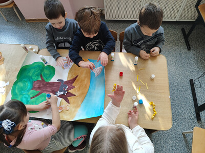 Вместе с Котом Учёным дети отправились в путешествие по Лукоморью: отгадывали загадки из волшебной корзинке, и создали большую общую картину «У лукоморья дуб зелёный».
