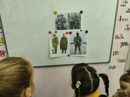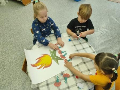 На занятии детям было дано элементарное представление о празднике «День Неизвестного солдата». С детьми были разобраны значение слов «подвиг», «память», «герой», «Вечный огонь». В конце занятия выполнена коллективная аппликация «Цветок памяти».