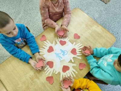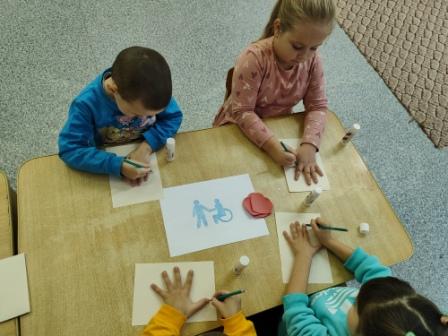 С целью формирования гуманного отношения к детям с ограниченными возможностями, воспитания духовно- нравственных качеств личности в рамках проведения Международного Дня инвалидов в разновозрастной группе была проведена беседа "Мы разные". После чего дети выполнили коллективную аппликацию "Дарим свои сердца"