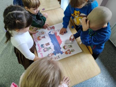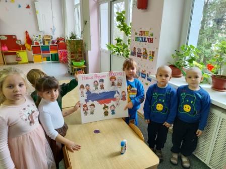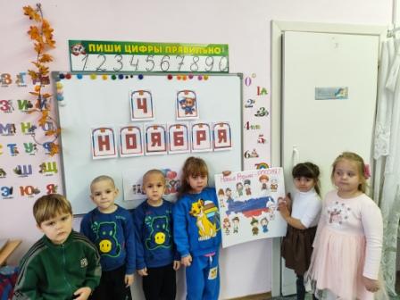 Сегодня с детьми проведено тематическое занятие, посвященное Дню народного единства. Дети поучили элементарные представления об этом празднике, познакомились с флагом России как одним из главных символов страны. Усвоили, что Россия - многонациональная страна, и все народы в ней живут дружно. Дети проявили интерес, активно участвовали в беседе, играх и творческой деятельности. Была выполнена коллективная работа «Наша Родина - Россия!», которая размещена в группе как наглядный итог занятий.